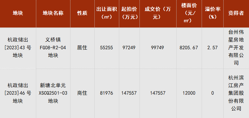 經過1輪報價,最終以起拍價成交,競得單位為杭州濱江房產集團股份有限公司。
